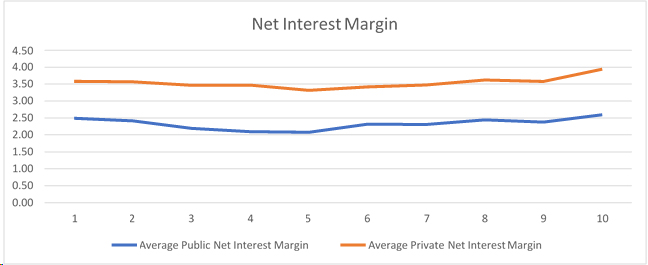 Fig 4.1 Net Interest Margin Line graph of Public and Private Sector Banks over the last 10 years
