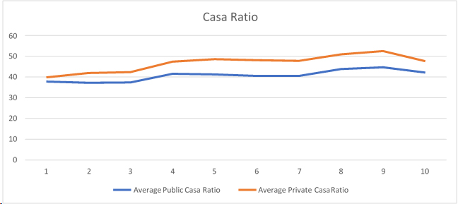 Fig 4.2 Casa Ratio Line graph of Public and Private Sector Banks over the last 10 years
